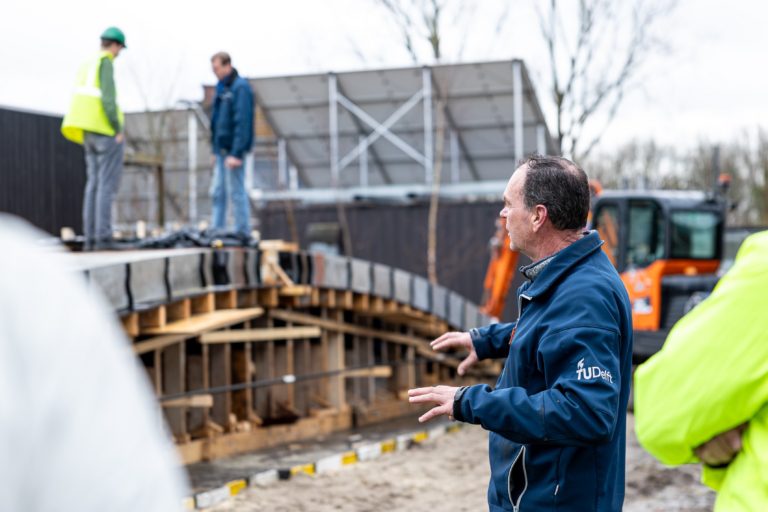 Ir. Ate Snijder (Faculteit Bouwkunde) en Em. prof. ir. Rob Nijsse (Faculteiten Civiele Techniek en Geowetenschappen en Bouwkunde) van de TU Delft ontwikkelden de afgelopen jaren een concept voor het construeren van circulaire, modulaire constructies van gerecycled materialen of materialen met een lage CO₂-uitstoot. Het is hun doel om afvalstromen om te zetten naar modulaire bouwblokken om daarmee circulaire bruggen te bouwen. Met dit eerste voorbeeld bij ons op TU Delft Campus willen ze laten zien dat dit concept werkt en hopen ze dat er op termijn wereldwijd op deze manier wordt gebouwd.