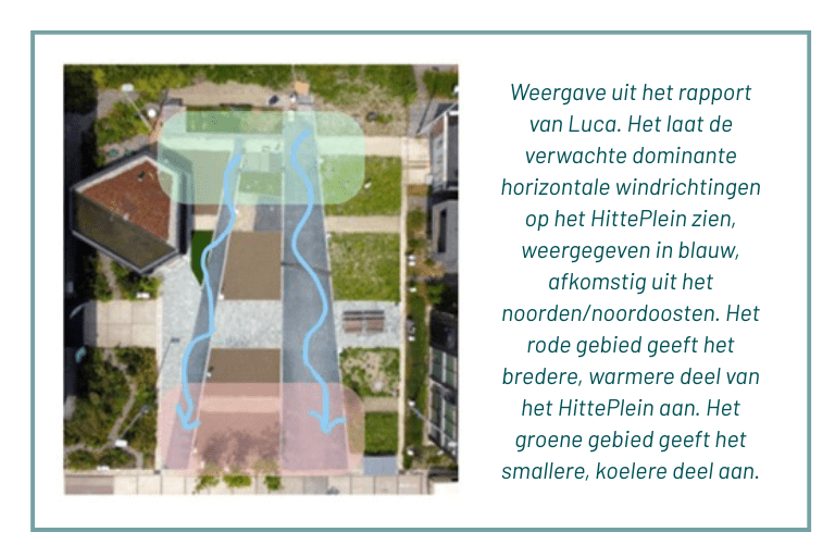 Kan plein-ontwerp een kunstmatig briesje creëeren voor verkoeling tijdens warme dagen? Studente Environmental Engineering Luca Böstfleisch onderzocht het op het HittePlein. Haar onderzoek laat zien dat onder de juiste omstandigheden het ontwerp van het HittePlein kan bijdragen aan het creëeren van een klein maar verkoelend briesje. Dit briesje ontstaat wanneer de zonnestraling hoog is, het warm is en het niet te hard waait.