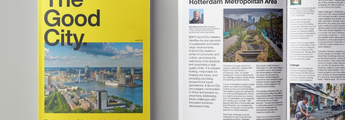 Wat gebeurt er als een stad, die voor een groot deel onder de zeespiegel ligt, besluit om het water niet te weren, maar te omarmen? In de nieuwe editie van BDP’s Good City Papers verkennen Fleur Dassen (The Green Village) en Björn Bleumink (BDP) hoe Rotterdam de risico’s op gebied van klimaatverandering omkeert tot kansen voor stedelijke transformatie.
