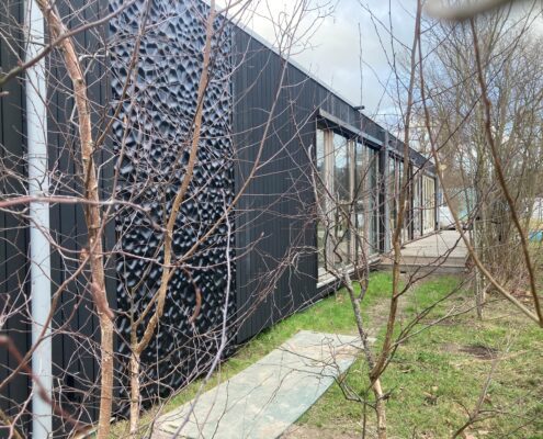 Het gevelpaneel dat aan de achterkant van ons kantoor is bevestigd, is hier een mooi voorbeeld van. Deze is gemaakt van voedselresten. Bij plaatsing was deze glanzend, na driekwartjaar zie je dat deze meer in de natuur opgaat, precies zoals de bedoeling is. Inmiddels is het paneel lichter van kleur geworden en zie je de natuurlijke ingrediënten. Dit komt door weersinvloeden als zon en regen. Echter hebben deze veranderingen geen negatieve invloed op de kwaliteit van het paneel.