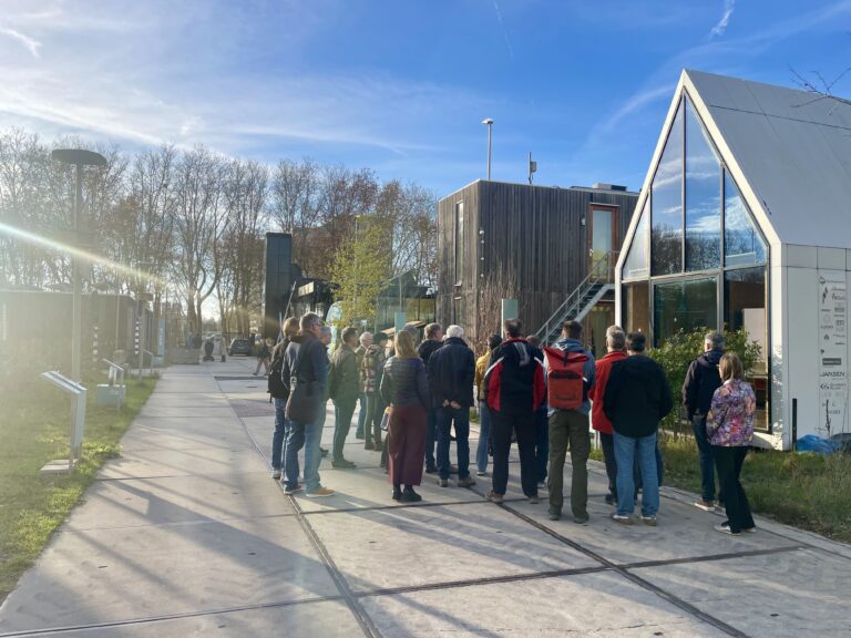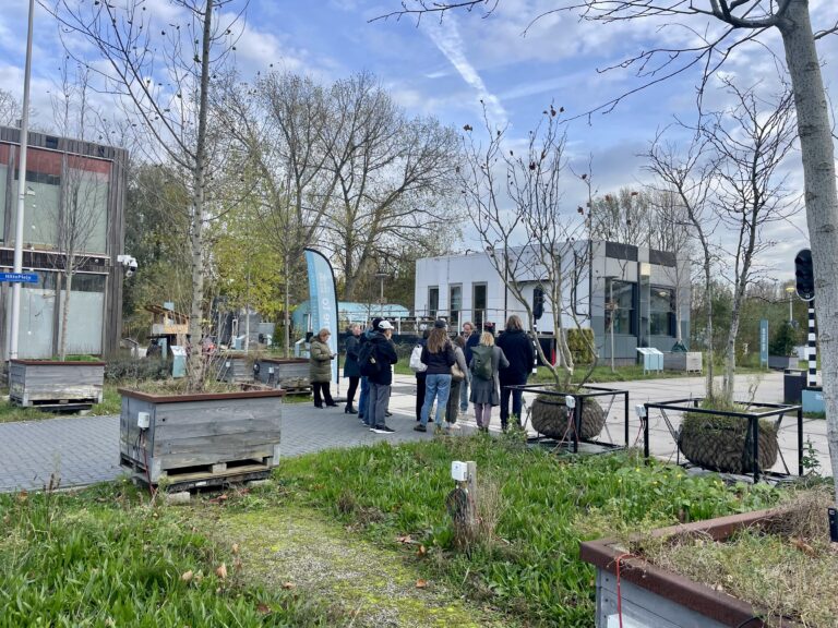 Tijdens de tours namen onze projectmanagers de groepen mee langs projecten op het terrein. Bijvoorbeeld hittestress-innovaties op ons HittePlein, ons innovatieve Battery Lab en biobased gevels. Deze week liet opnieuw zien hoe realistisch onze experimenteeromgeving is: of het nu zon of regen was, de tours gingen gewoon door!
