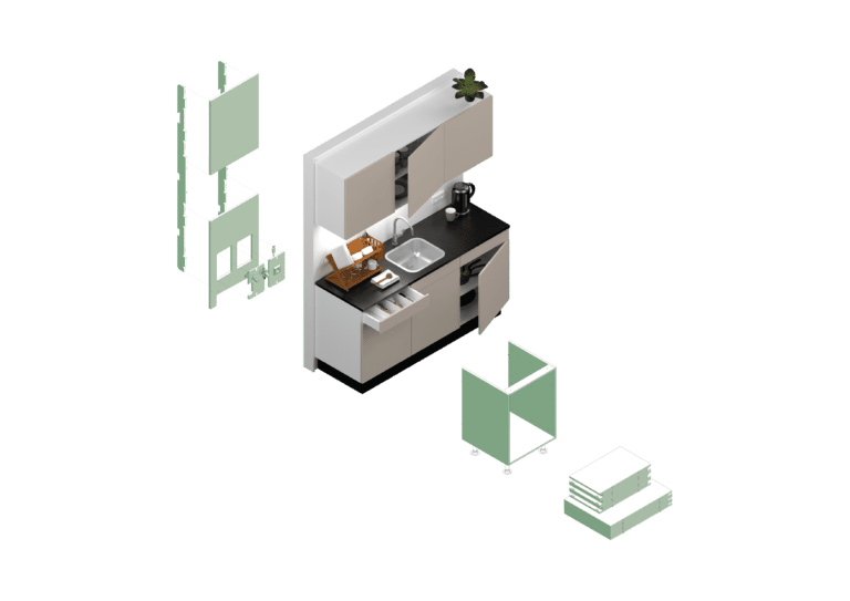 NoWa Kitchen is een losmaakbare, circulaire keuken waarvan onderdelen eenvoudig te vervangen zijn en materialen goed te scheiden voor hergebruik en recycling. Door zoveel mogelijk biobased materialen toe te passen, bereikt de keuken een Product Circularity Index van 90%.
