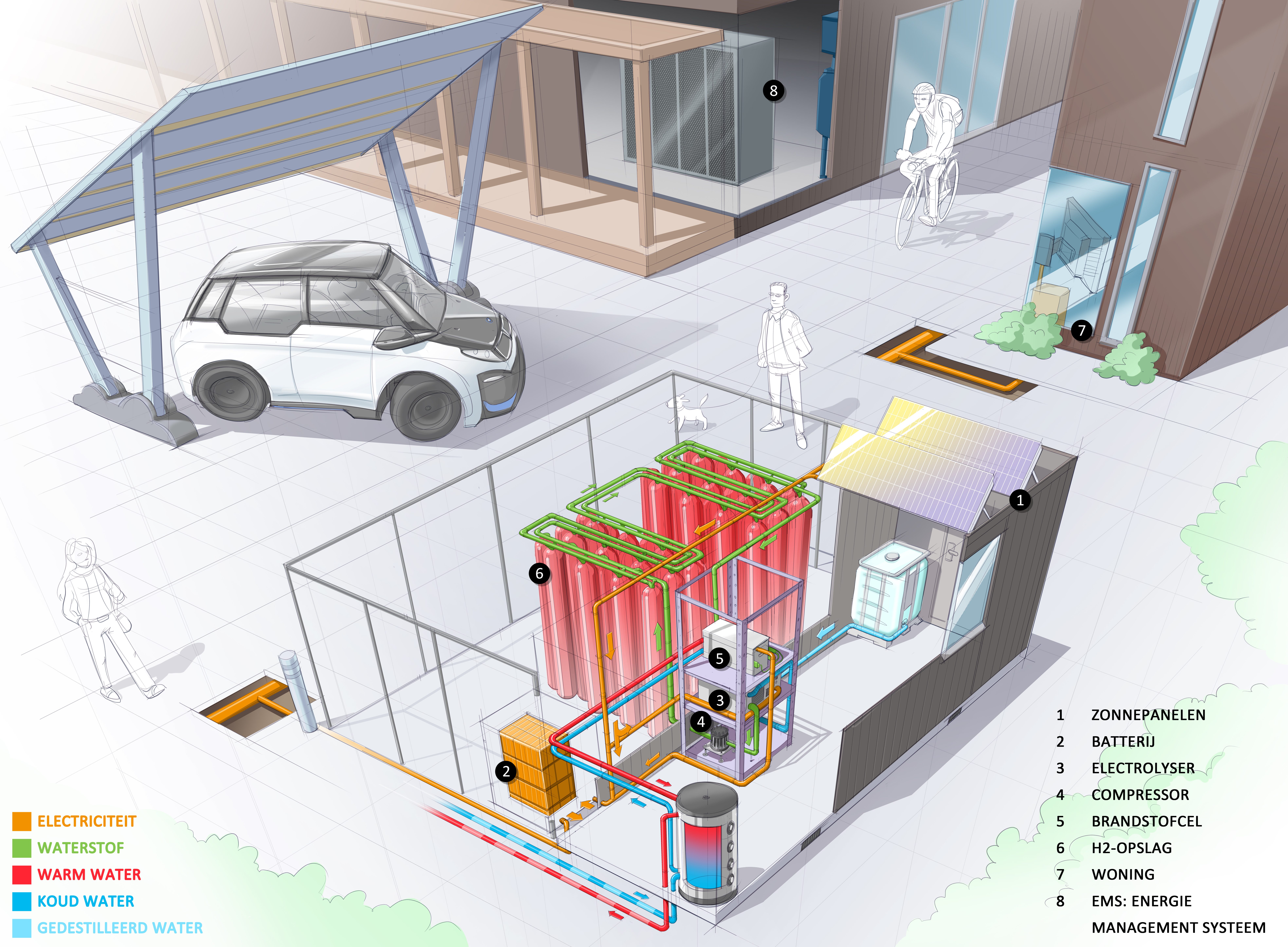 Een centrale rol in het project is weggelegd voor het Electronic Management System (EMS). Het EMS gaat de verschillende technische onderdelen aansturen. Daarbij rekening houdend met zoveel mogelijk variabelen, zoals het weer op dat moment, de weersvoorspelling en de te verwachten vraag en aanbod. Schmitz: ‘Het EMS moet met intelligente algoritmes vragen als Ga ik de nu opgewekte energie omzetten in waterstof of moet ik eerst de elektrische auto opladen? beantwoorden. Zo’n geïntegreerd systeem bestaat nu nog niet, maar is cruciaal om er zeker van te zijn dat de leverbetrouwbaarheid van dit nieuwe, lokale, CO2-vrije systeem straks net zo groot is als de leverbetrouwbaarheid van het conventionele systeem. Nederland is gewend aan meer dan 99,9 procent leverbetrouwbaarheid, dat moeten we wel evenaren.’